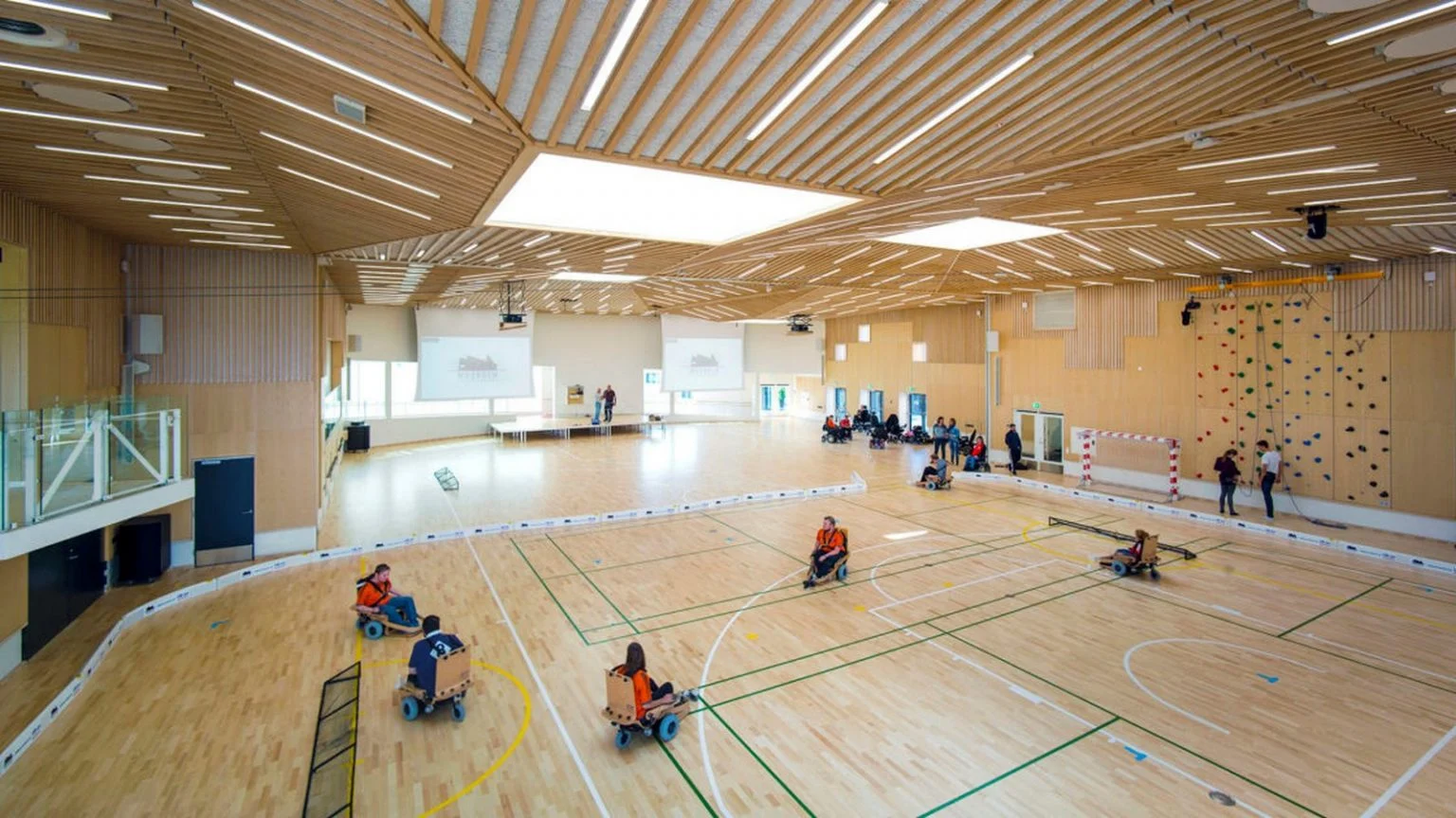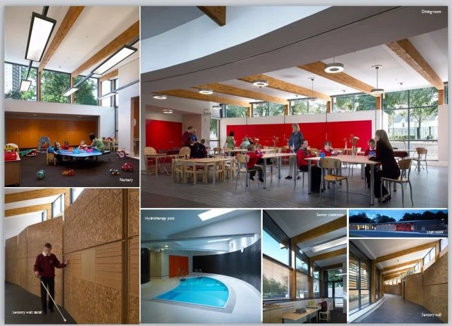 The Hazelwood School in Glasgow is a good example of inclusive design. The structure is created for pupils with two sensory disabilities. It has a “sensory wall” constructed of textured cork that lets students feel their way around.
