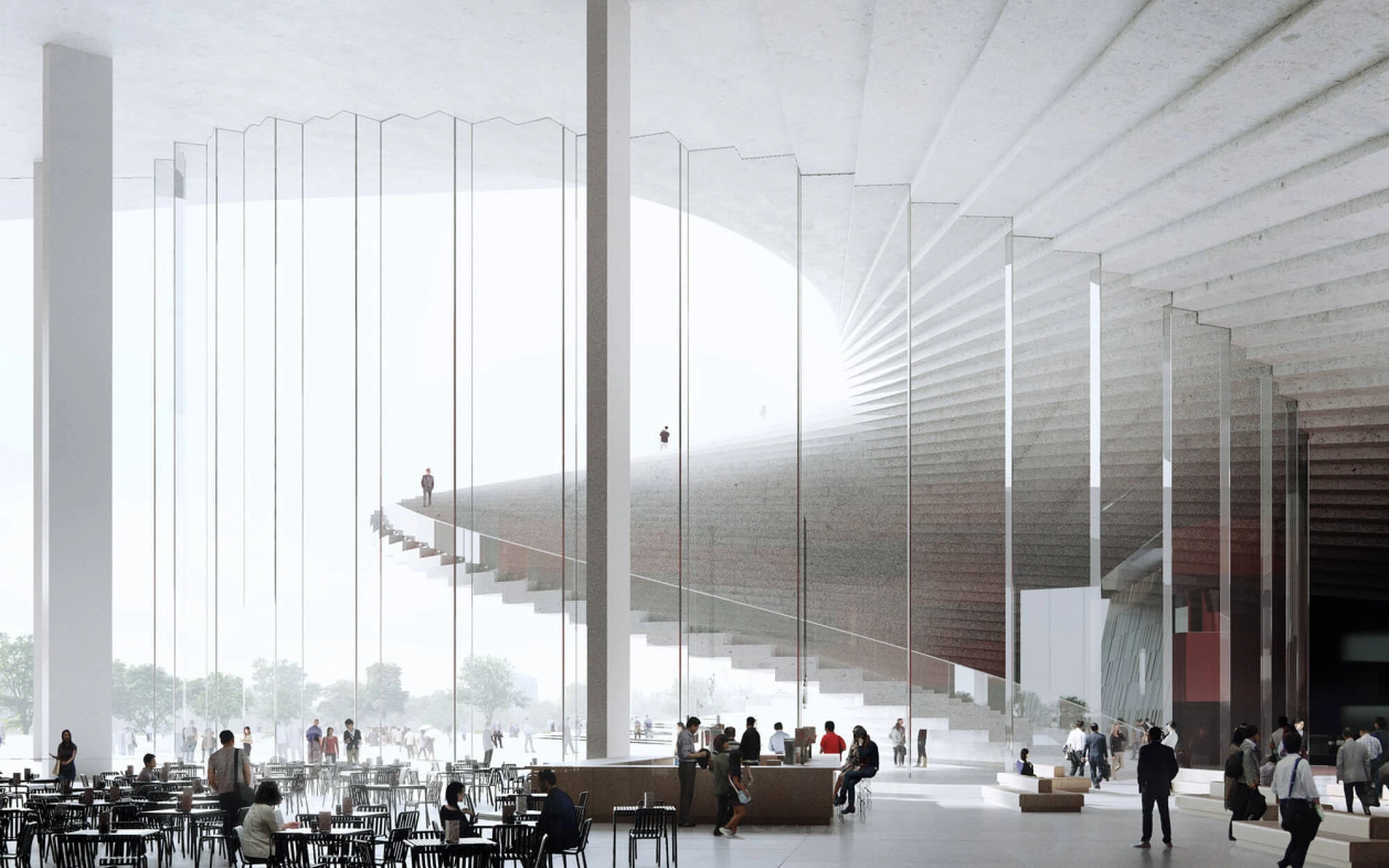 Its helical roof, which spirals up to form a huge public stairway, is the most interesting part.