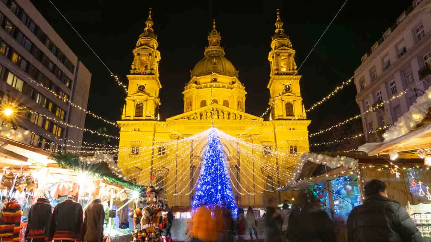 The Basilica is the most attractive part of Budapest’s Christmas market, which is one of the best in Europe. The history of 3D light mapping continues in 2025. Stories about the holidays are projected directly onto the neoclassical facade of the cathedral, making the stone look like it’s moving and dancing.
